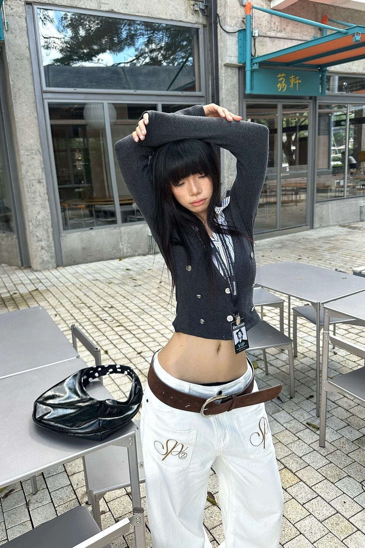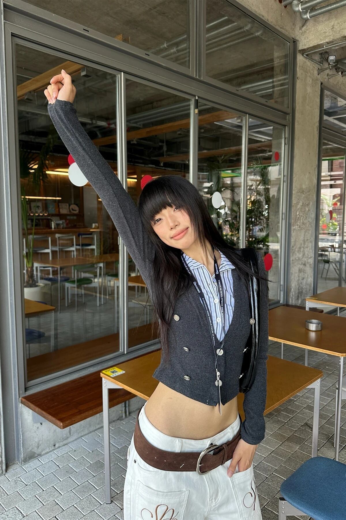重ね着風 クロップド トップス ストライプシャツ ドッキング カーディガン ショート丈 タイト 長袖 韓国 Y2K ストリート グレー プレッピー レディース 10T-32