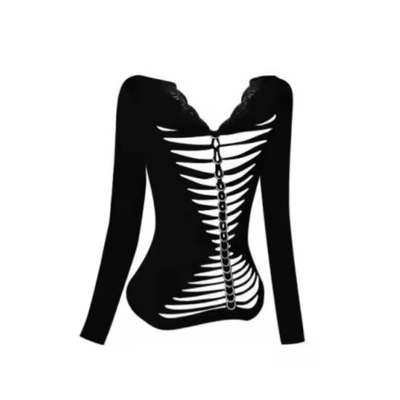 背中あき バックオープン ロンT トップス 長袖 背骨 ボーン 韓国 ストリート モード系 パンク セクシー ダンス 衣装 K-POP ギャル レディース 10T-32