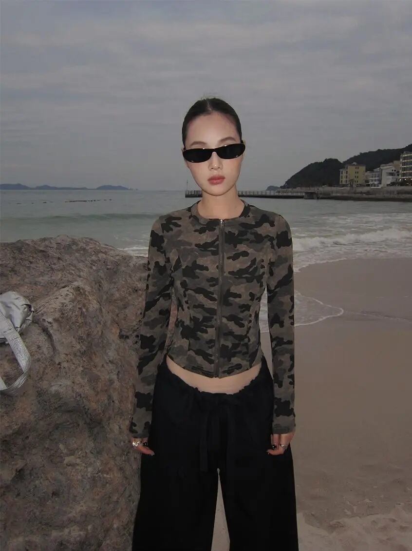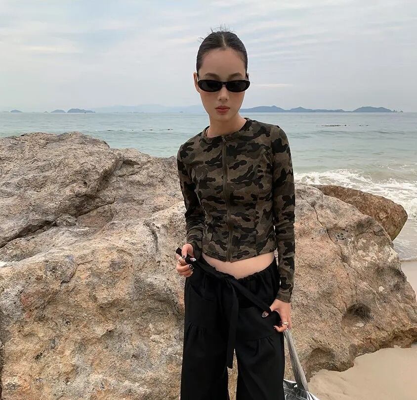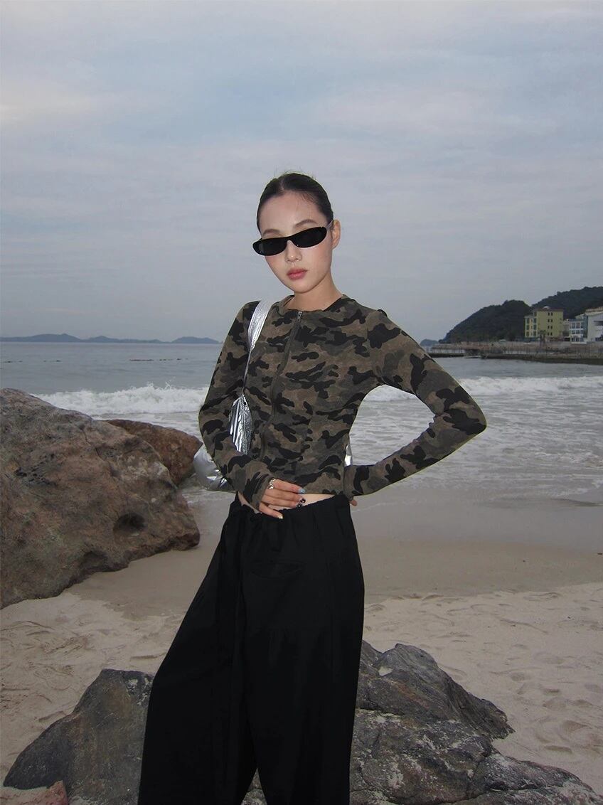迷彩柄 背中あき ロンT トップス 長袖 ジップアップ カーディガン カモフラ 韓国 ストリート Y2K ダンス 衣装 K-POP ギャル レディース 10T-32