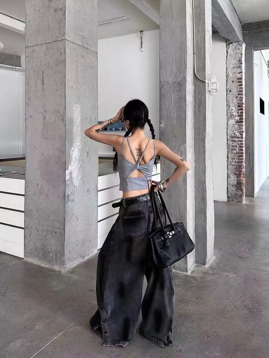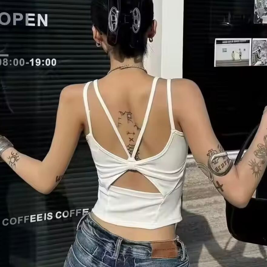 背中開き キャミソール ツイストデザイン ショート丈 カップ付き 黒 白 グレー 韓国 ストリート Y2K ダンス 衣装 K-POP ギャル バックシャン レディース 10T-38