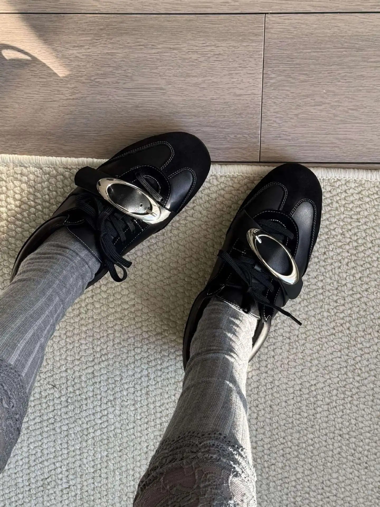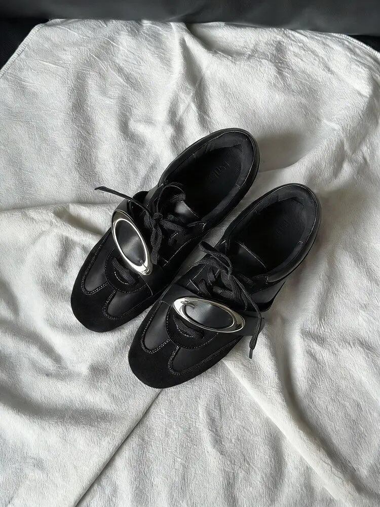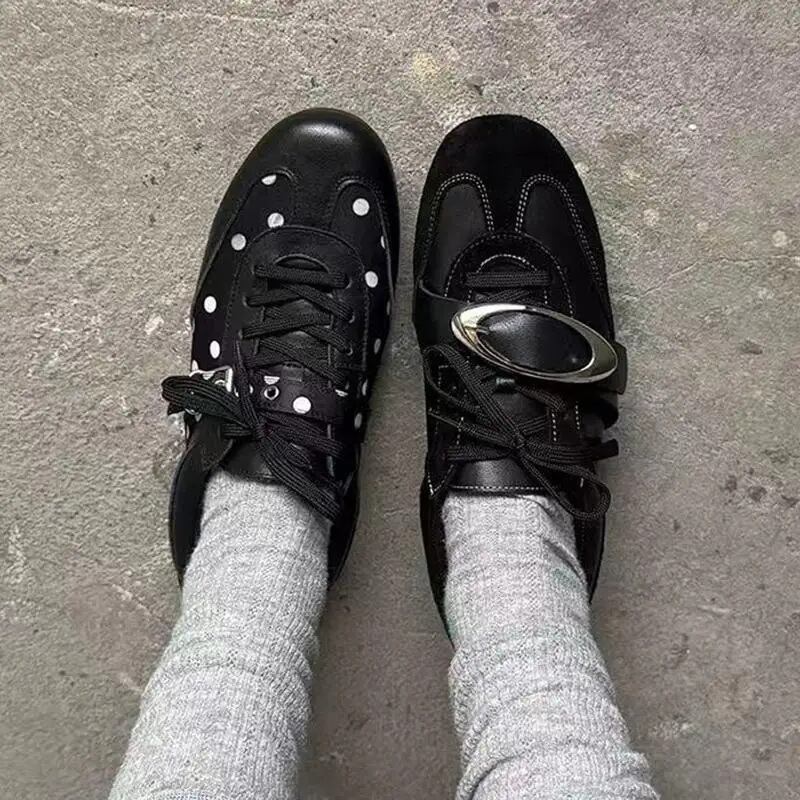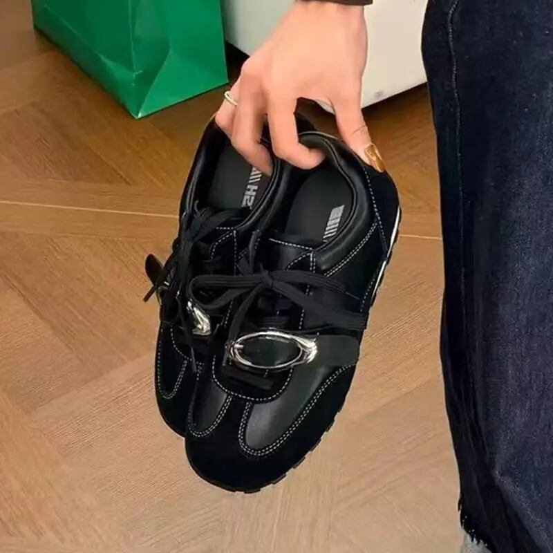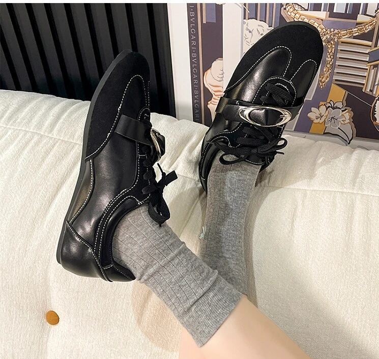 ビッグバックル フラット レースアップ シューズ 黒 メタル 韓国 ストリート モード系 パンク ローカット スニーカー風 靴 レディース 10SHO-3