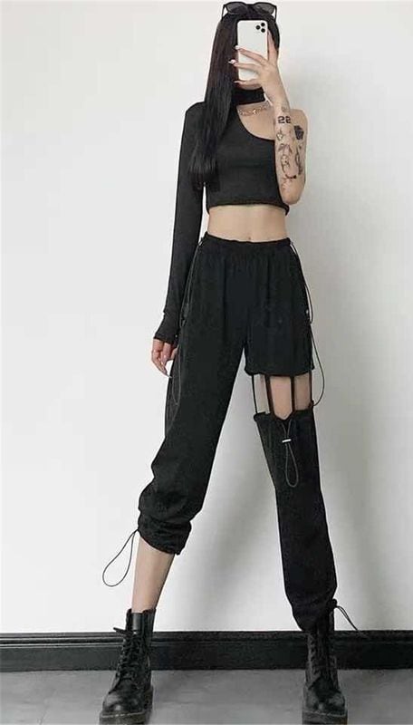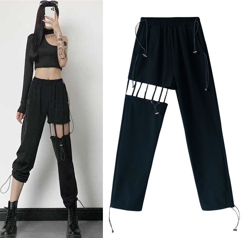 絶対領域 ロング パンツ スリット 韓国 ストリート系 ダンス 衣装 Y2Kファッション K-POP HIPHOP 黒 ギャル ドロスト レディース PA-1365
