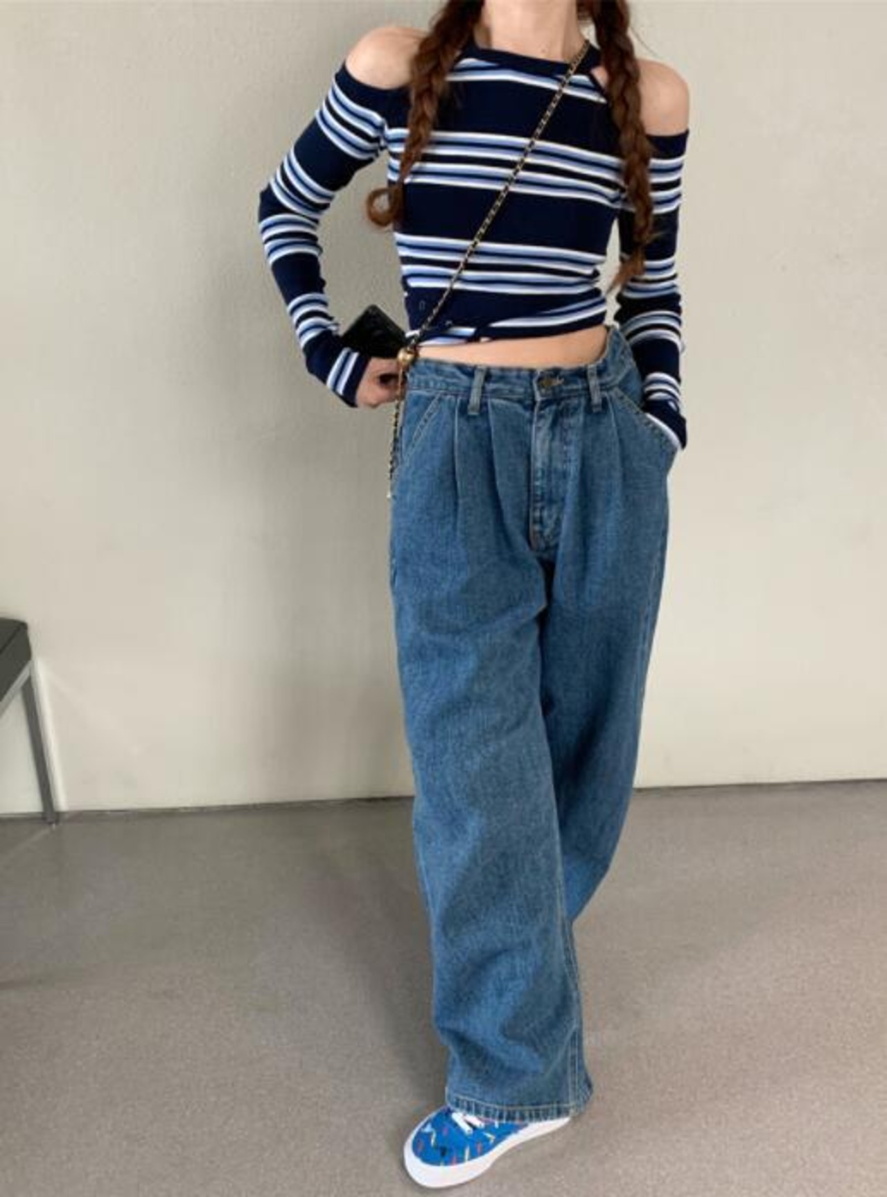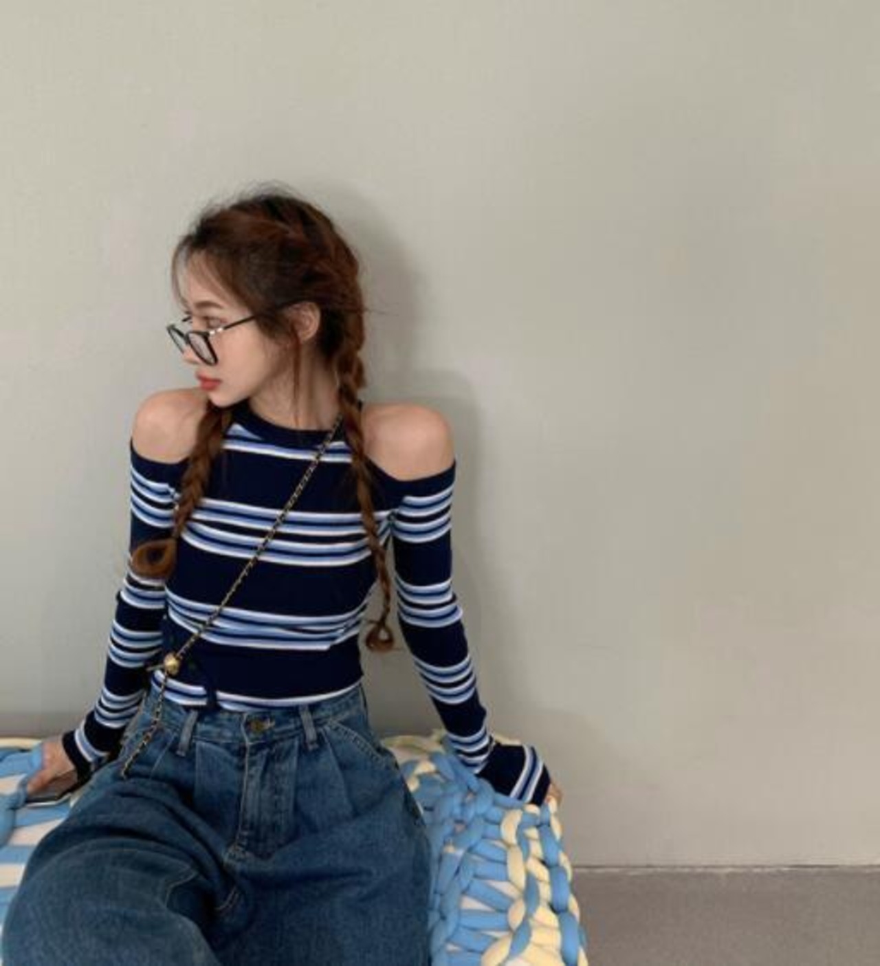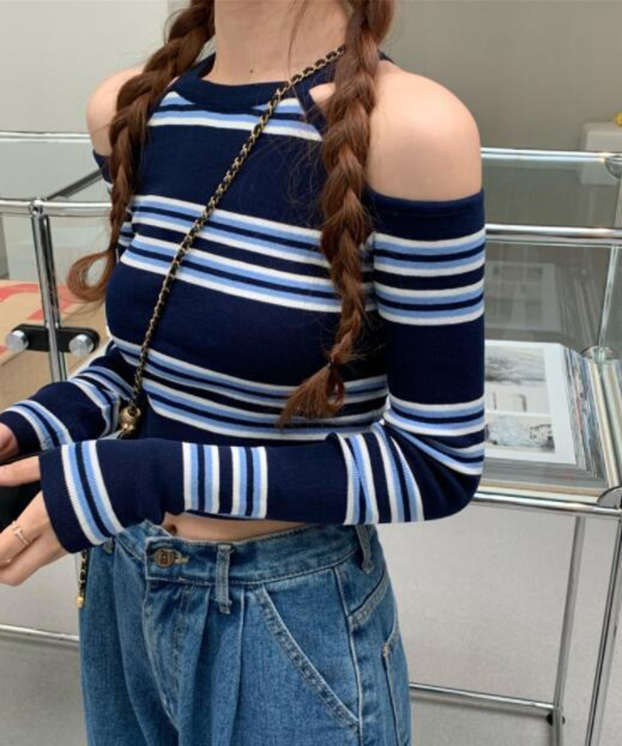 ボーダー柄 オフショル ショート丈 長袖 Tシャツ ロンT トップス アシメ 変形 韓国 ストリート Y2K ギャル レディース ファッション 7T-71
