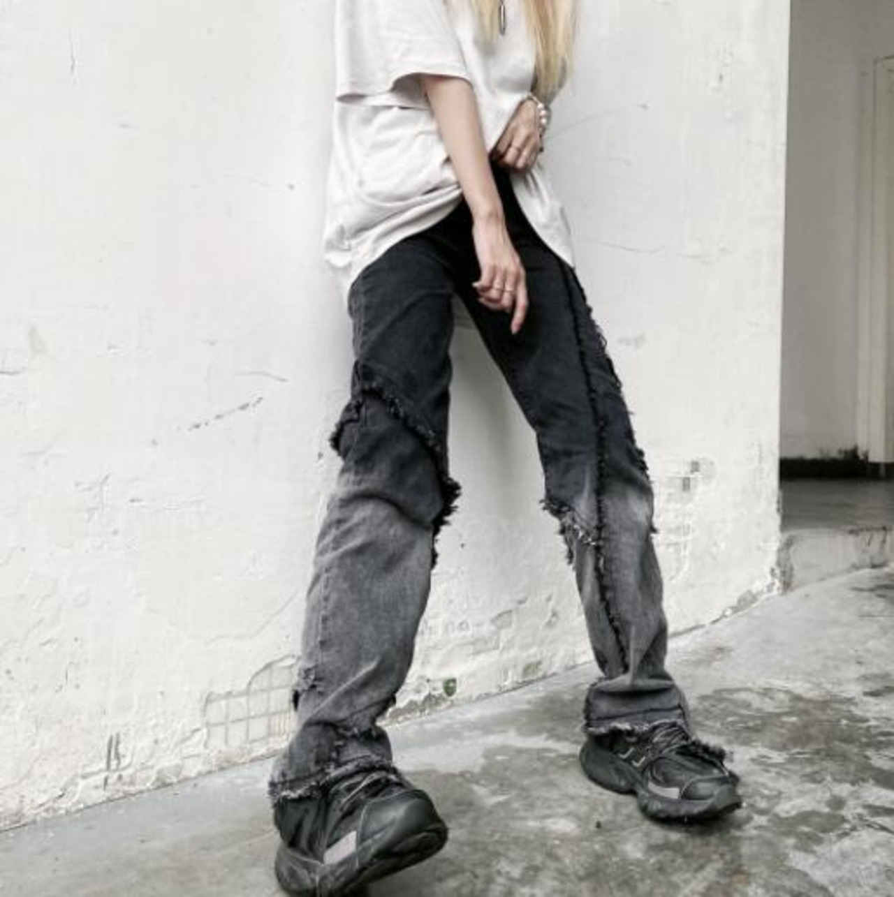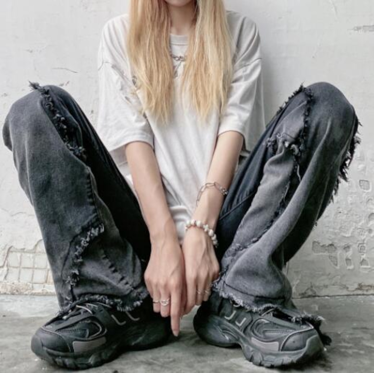 デニム パンツ ダメージ ジーンズ 韓国 ストリート系 グランジ ダンス オーバーダイ 黒 ブラック グレー レディース 7J-61