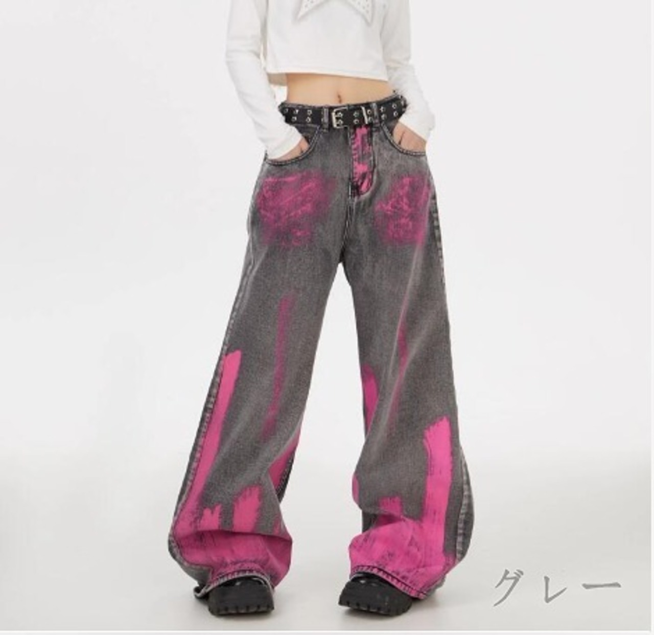 ペイント デニム パンツ ピンク 韓国 ストリート系 Y2Kファッション グランジ オーバーダイ ダンス 衣装 K-POP HIPHOP ジーンズ レディース 7J-221