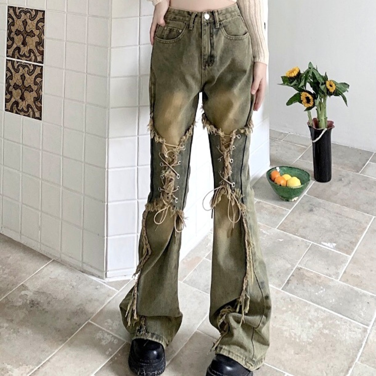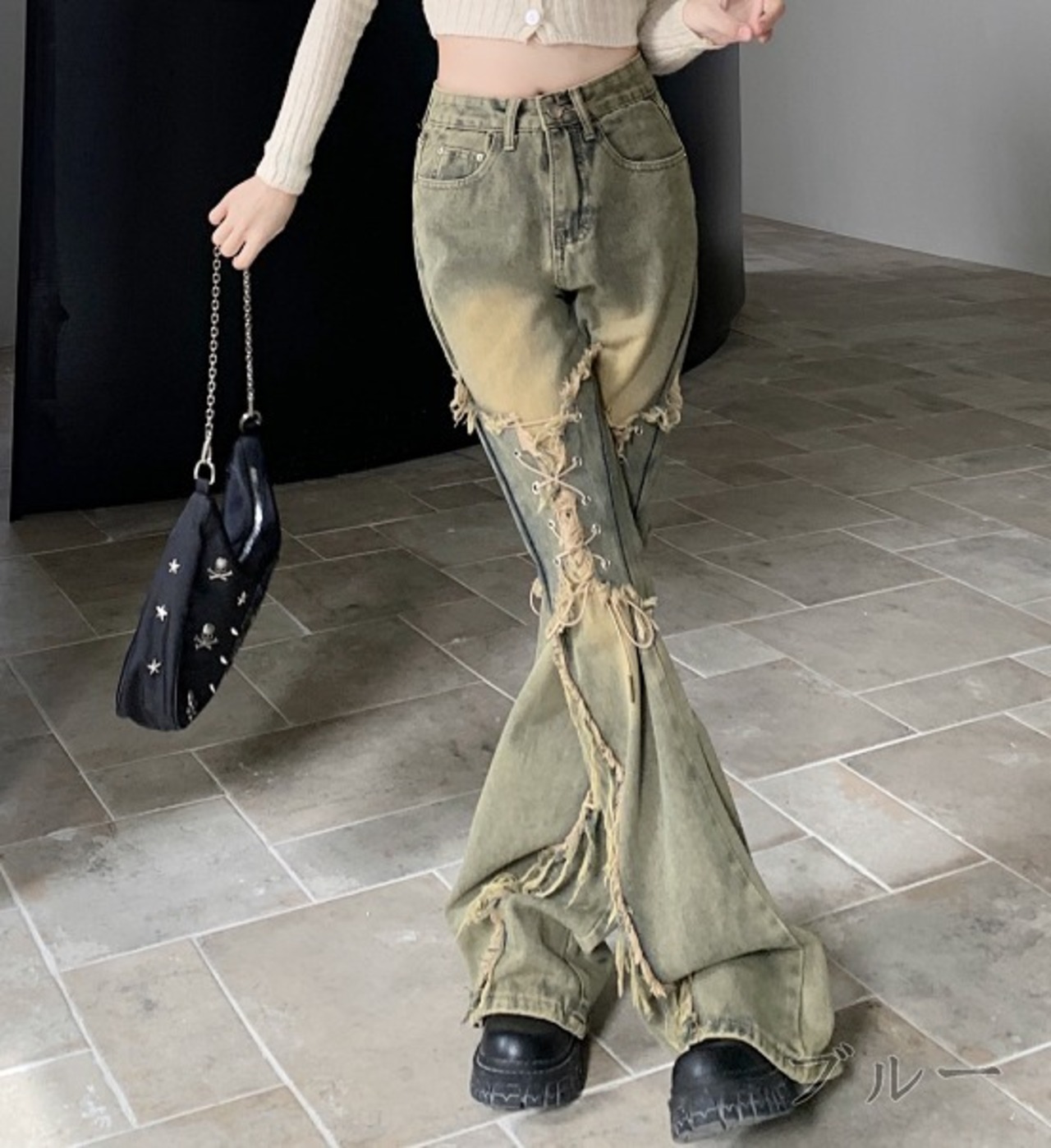 編み上げ フレア デニム パンツ 韓国 ストリート系 ギャル Y2Kファッション レディース ジーンズ 7J-224