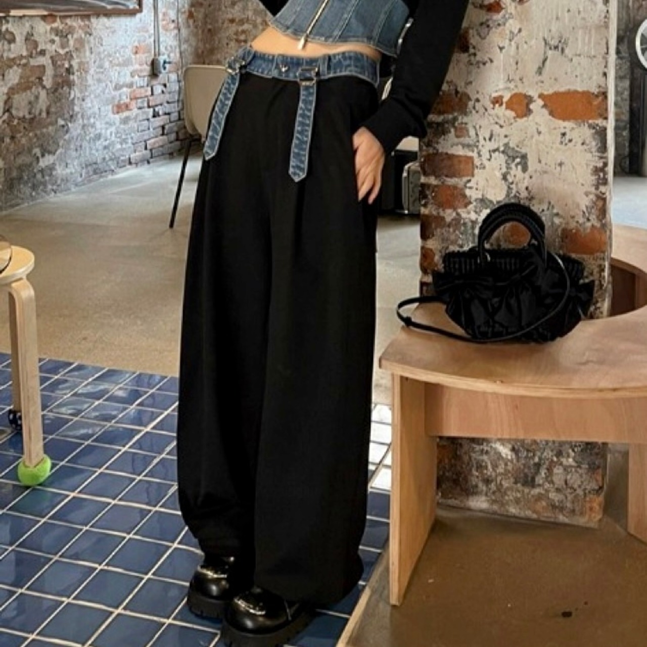デニム スウェット パンツ 切替 韓国 ストリート系 Y2Kファッション ダンス 衣装 K-POP ヒップホップ レディース 7J-238