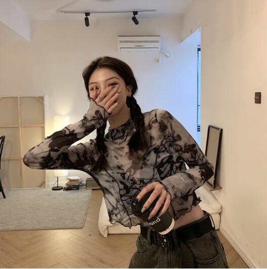 シアー ロンT タイダイ柄 トップス 長袖 Tシャツ 韓国 モード系 ギャル ダンス 衣装 ストリート K-POP ハイネック ショート丈 レディース 5T-601