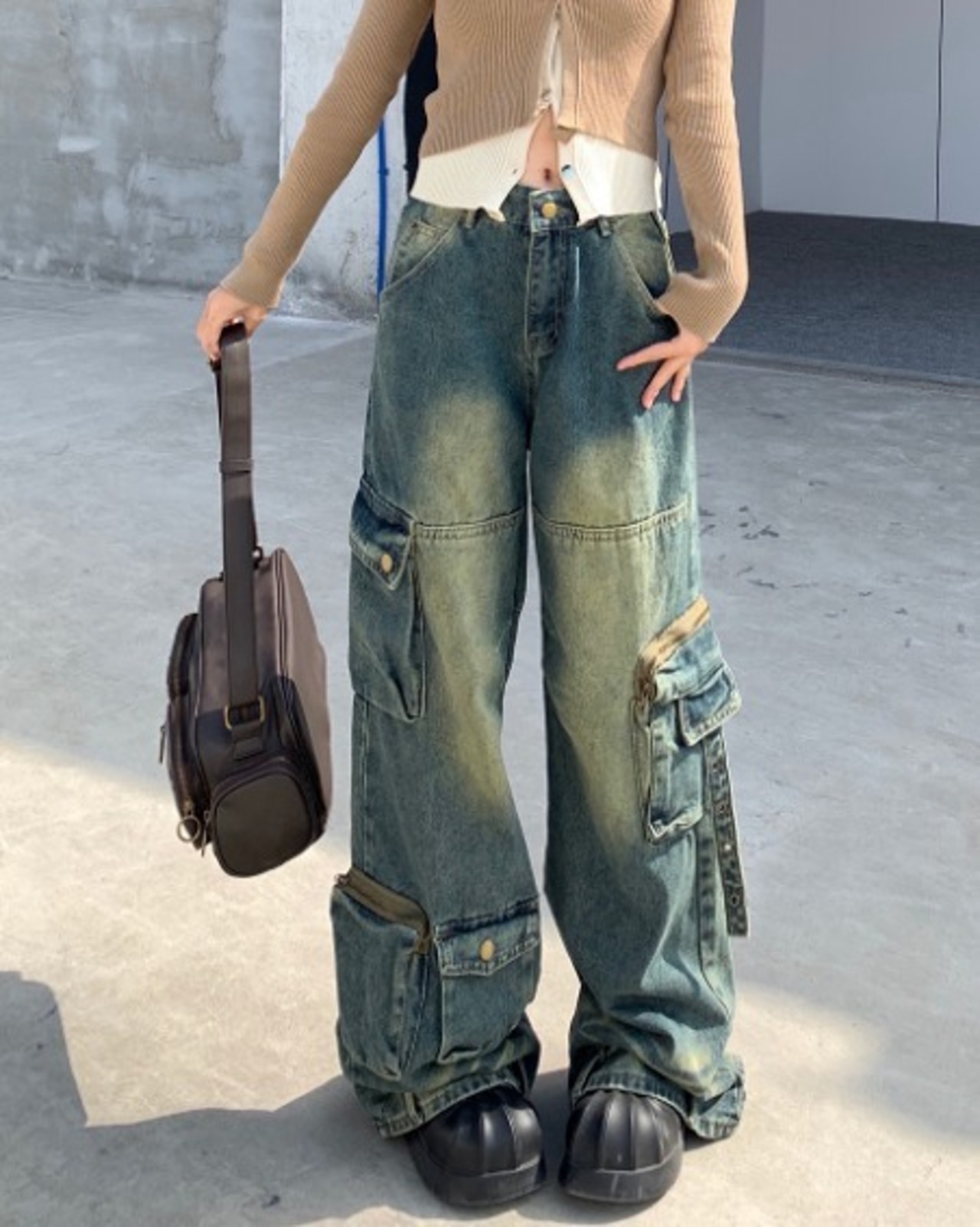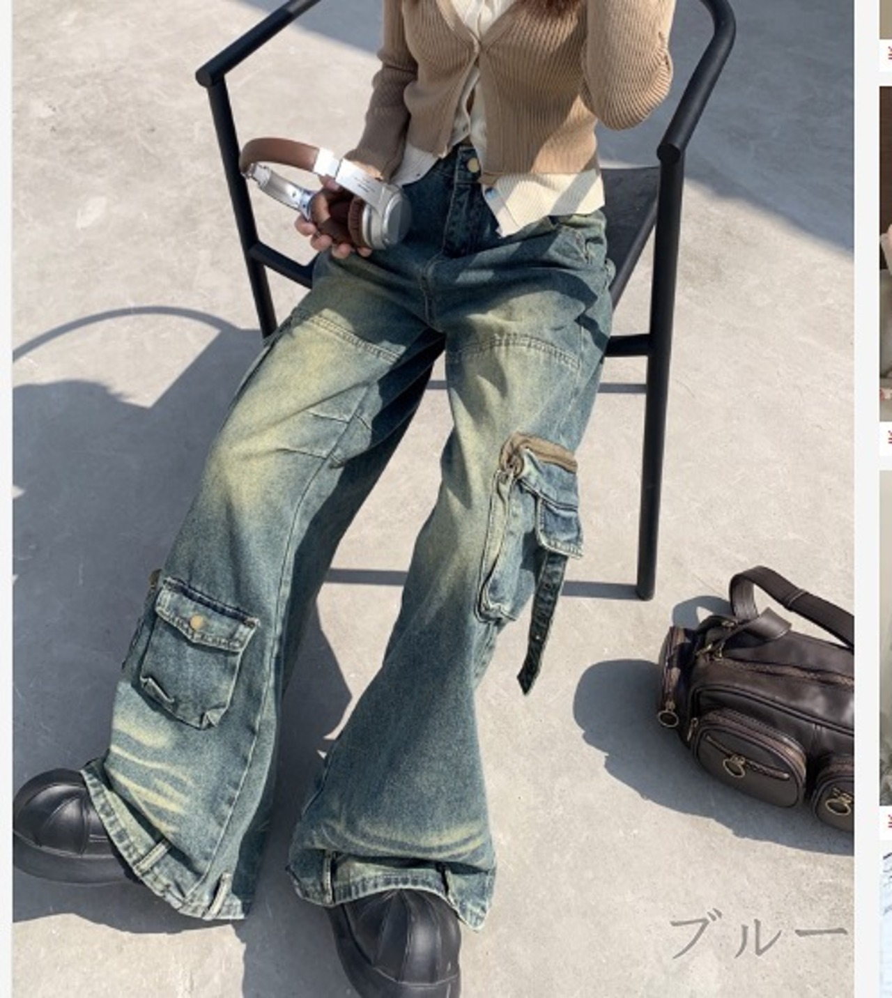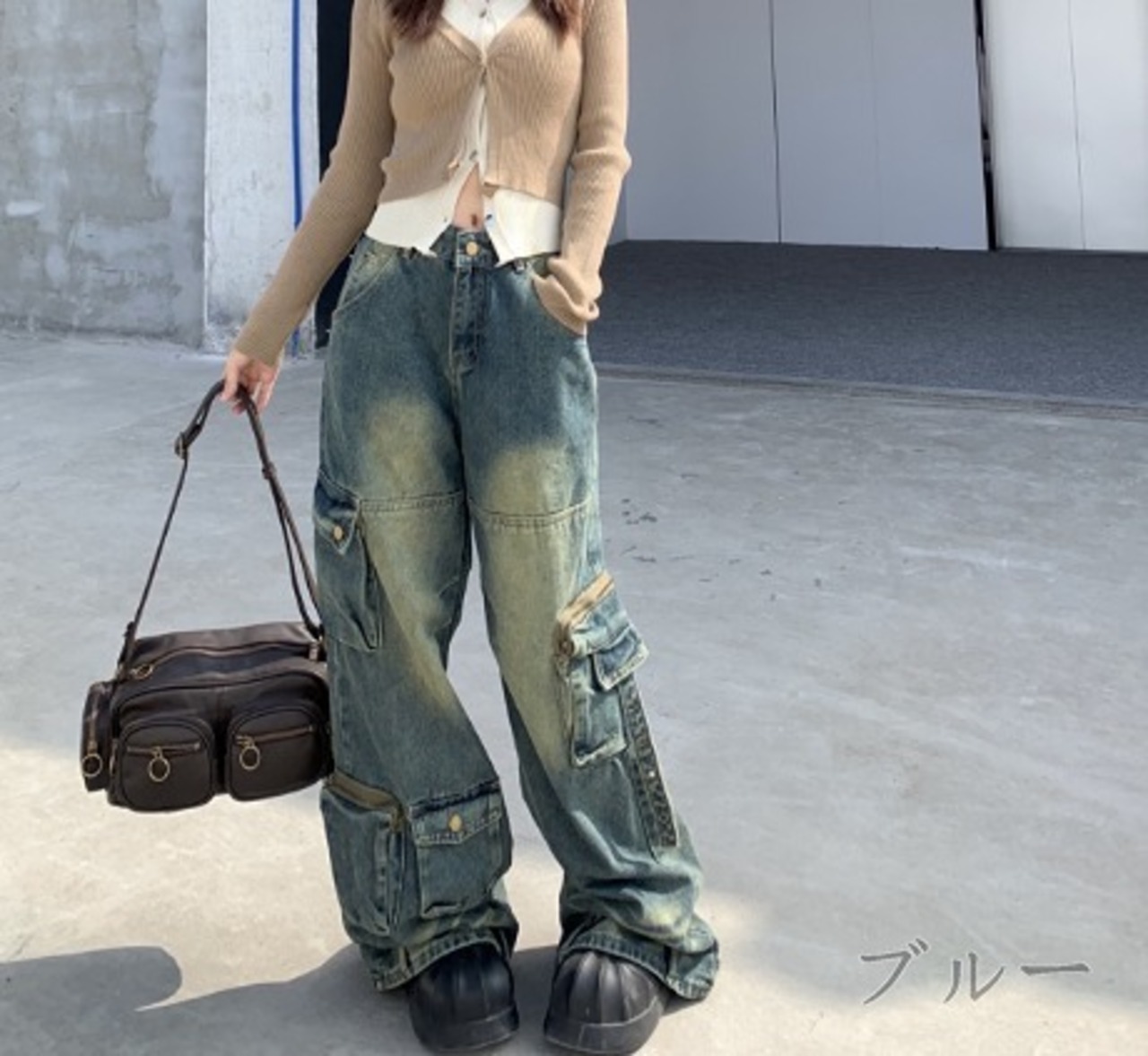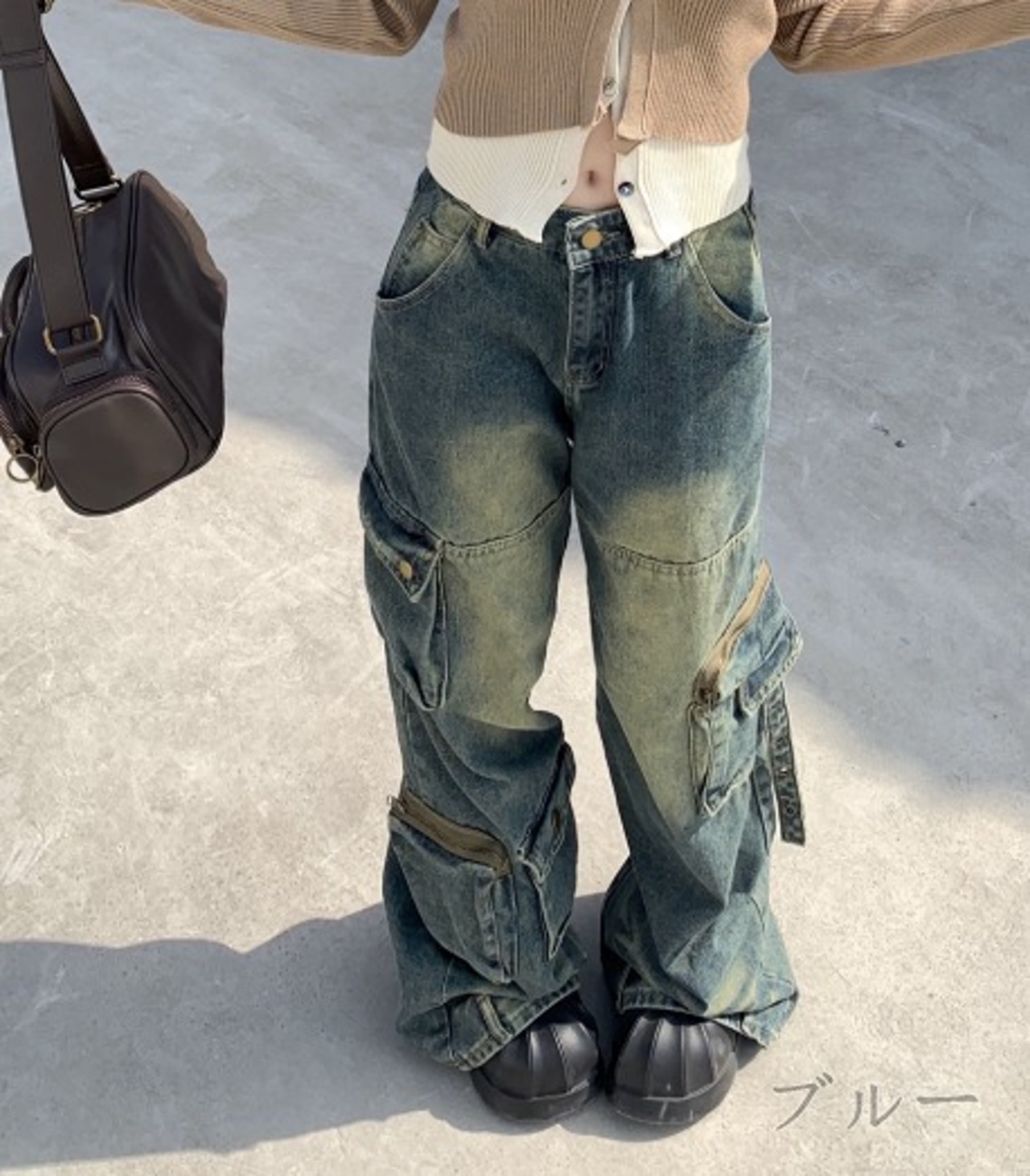 デニム カーゴ パンツ ジーンズ ポケット 韓国 ストリート系 Y2K グランジ ダンス 衣装 HIPHOP K-POP レディース 8J-13