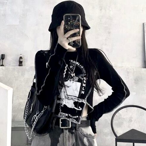ロゴ ロンT 長袖 Tシャツ 変形 アシメショート丈 トップス 韓国 ストリート系 黒 ダンス 衣装 K-POP レディース 8T-117