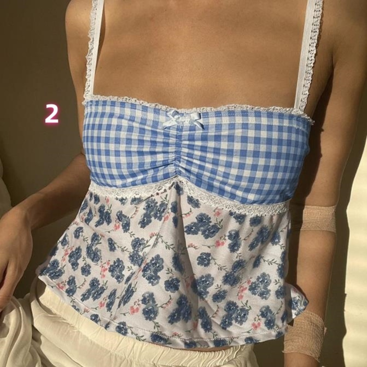ギンガムチェック 花柄 ビスチェ キャミソール レース 背中あき 切替 韓国 ストリート系 Y2Kファッション ダンス 衣装 K-POP 夏 レディース 8T-245