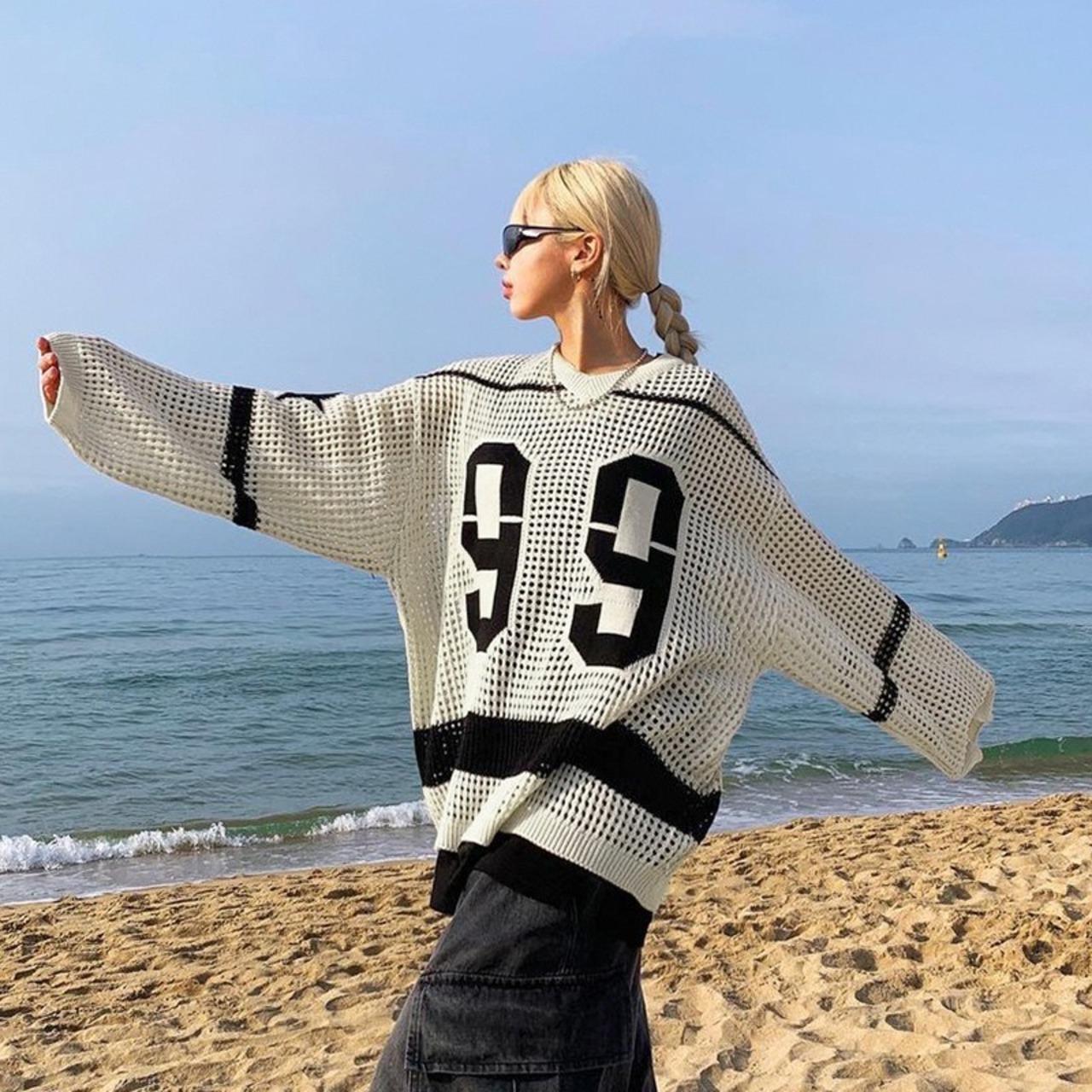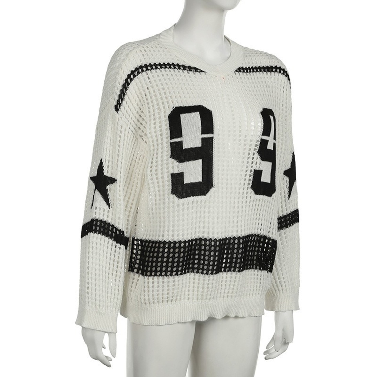 メッシュ セーター ニット ロゴ Vネック 韓国 ストリート Y2Kファッション 秋 春 レディース トップス 8NI-20