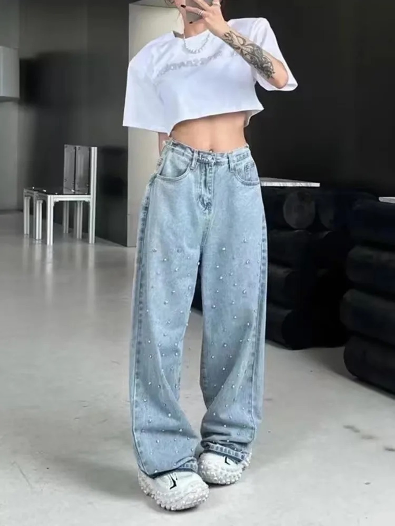 ラインストーン ビーズ ビジュー デニム パンツ ジーンズ 韓国 ストリート系 多系統 レディース ファッション 8J-138