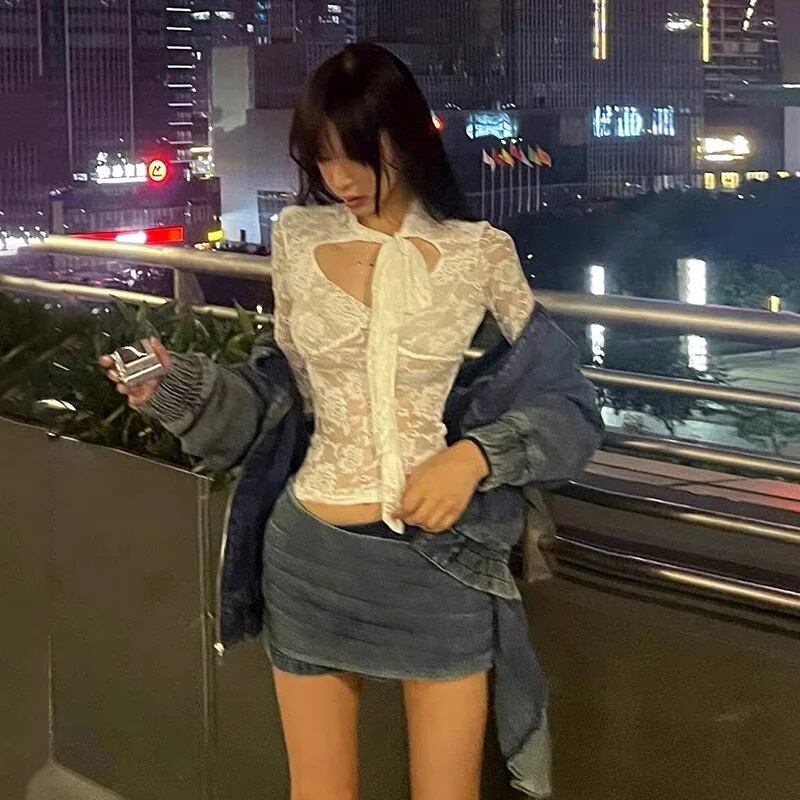 レース トップス ロンT リボン タイ 長袖 韓国 ストリート バレエコア ギャル 秋 春 レディース 8T-377