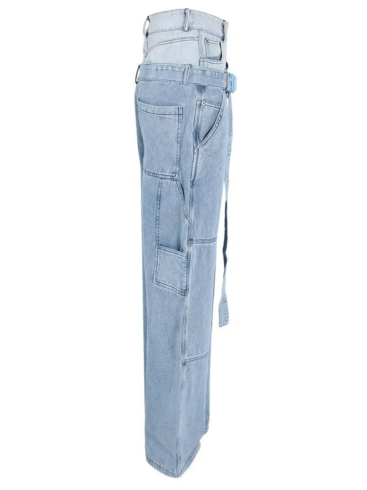 デニム パンツ ジーンズ ドッキング ダブルウエスト レディース 韓国 ストリート系 Y2K ダンス 衣装 K-POP HIPHOP ファッション 8J-159