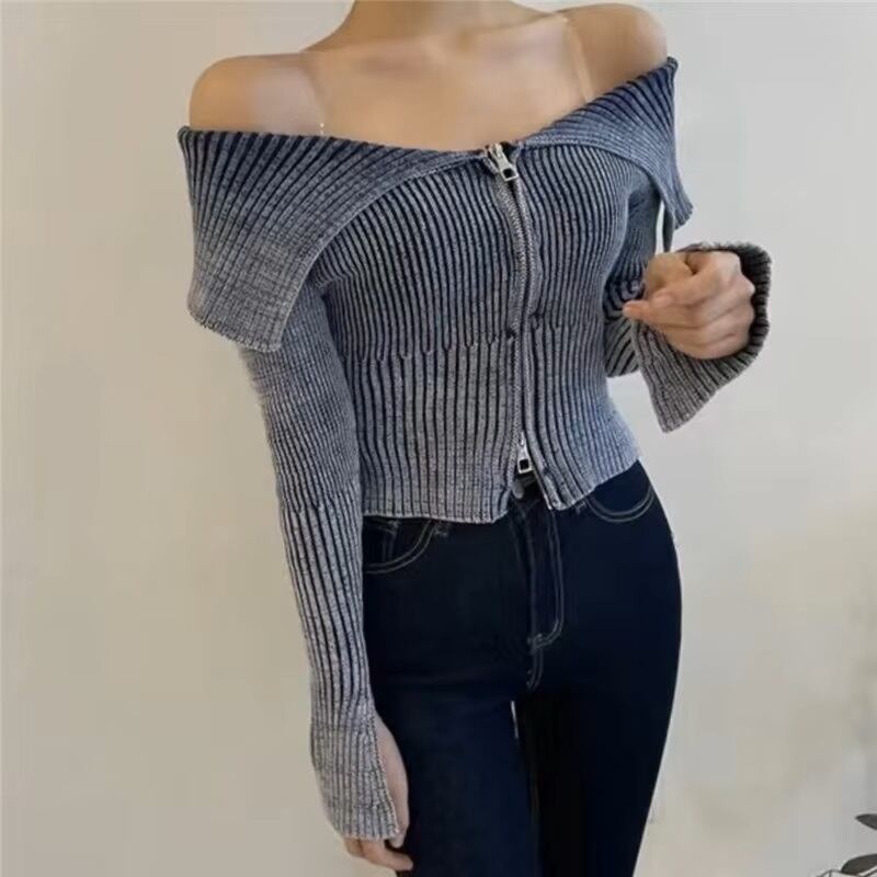 オフショル ニット トップス 韓国 ダブル ジップ リブ ファスナー 長袖 ショート丈 ストリート系 ギャル グランジ 秋 冬 春 レディース 8NI-37