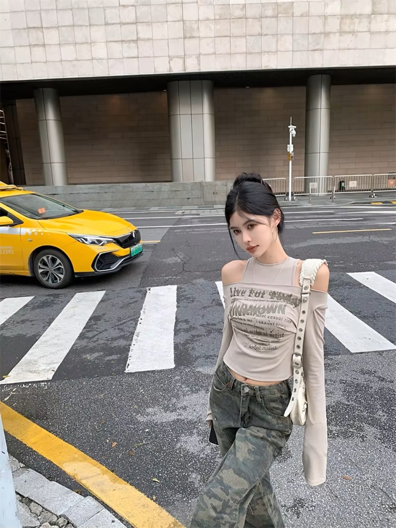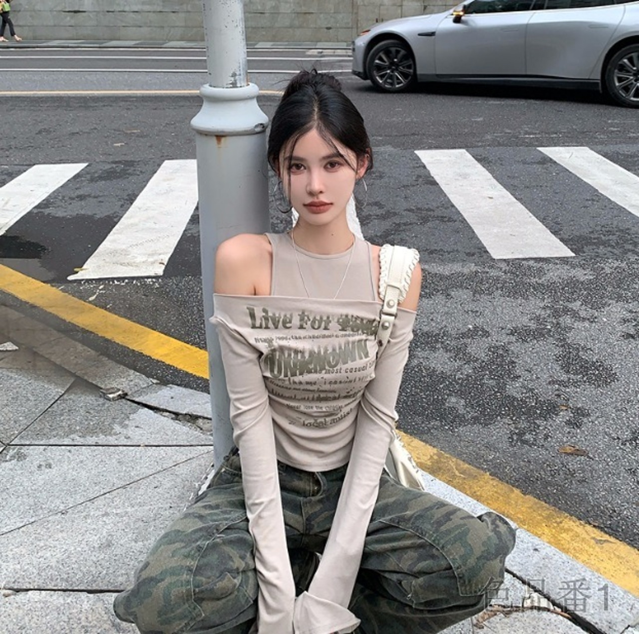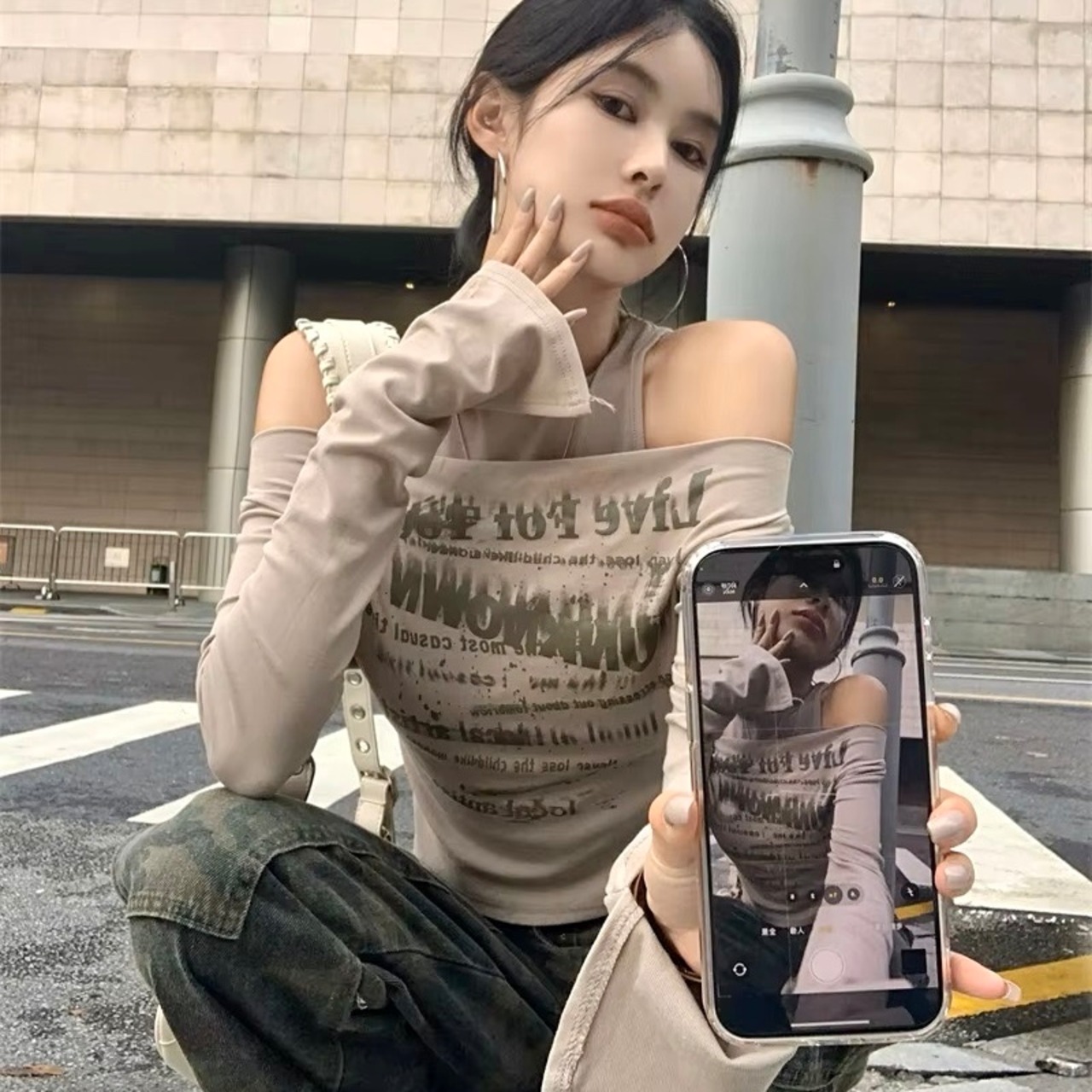 ロゴ オフショル 長袖 Tシャツ トップス ロンT ドッキング 重ね着風 韓国 ストリート系 Y2K グランジ ギャル レディース ファッション 8T-408