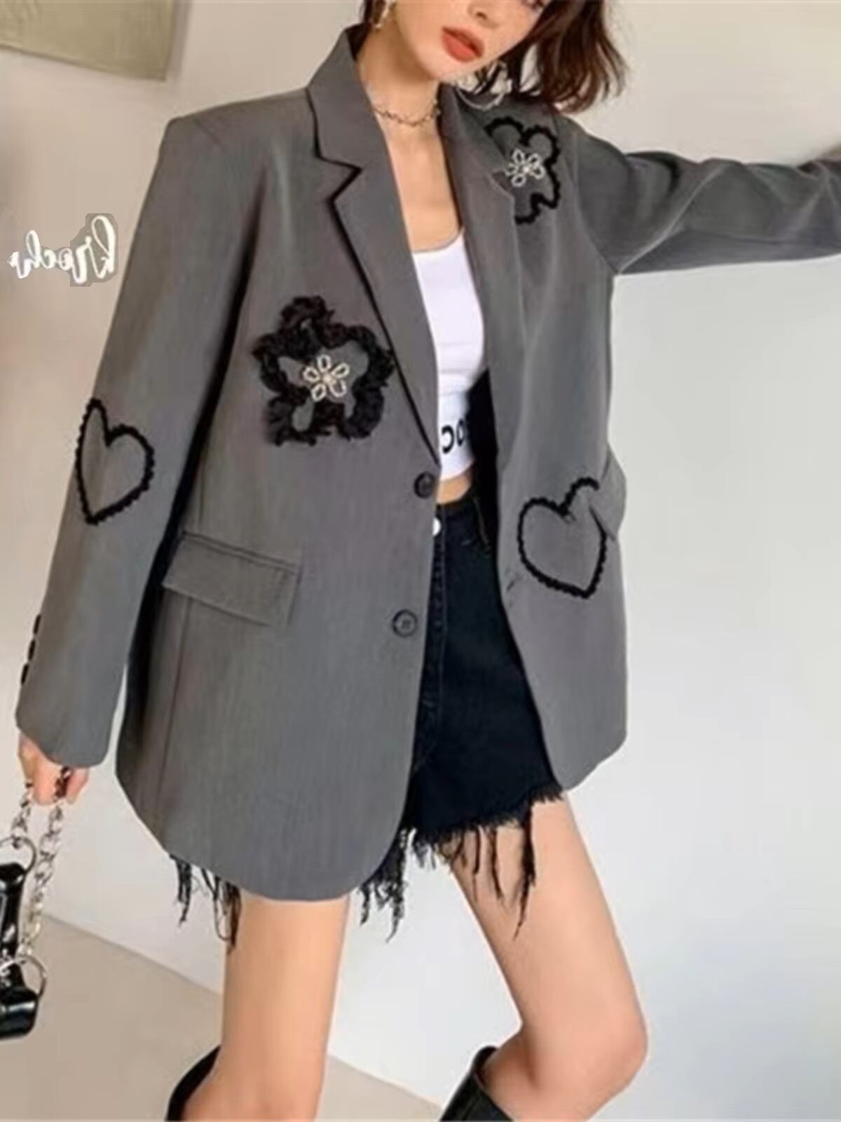 花柄 テーラード ジャケット レース 刺繍 ビーズ グレー 韓国 ストリート系 ガーリー 秋 春 レディース 8AU-85