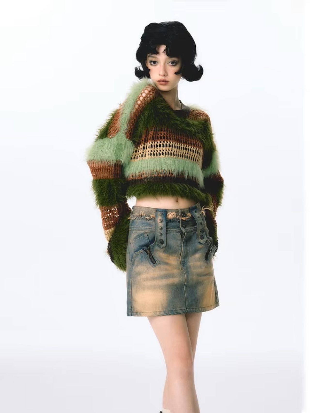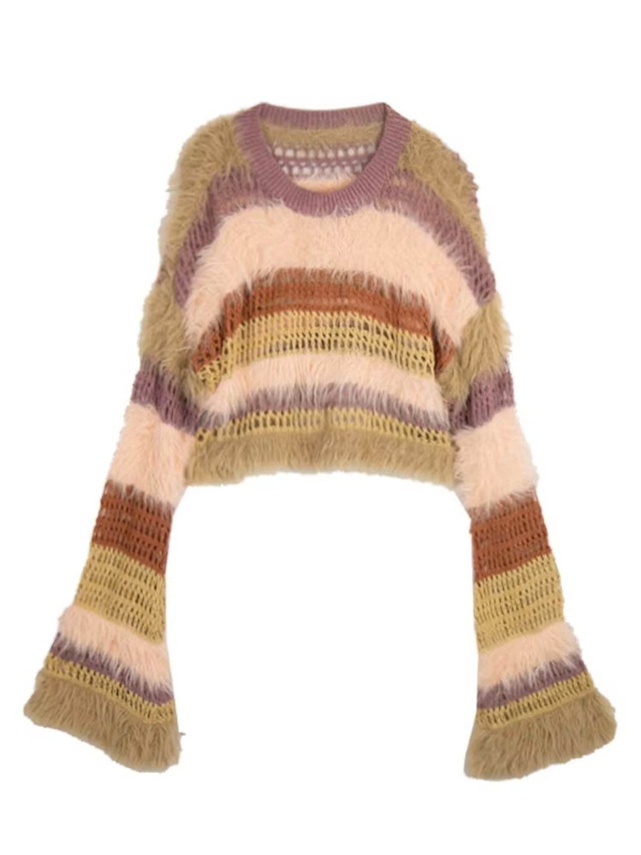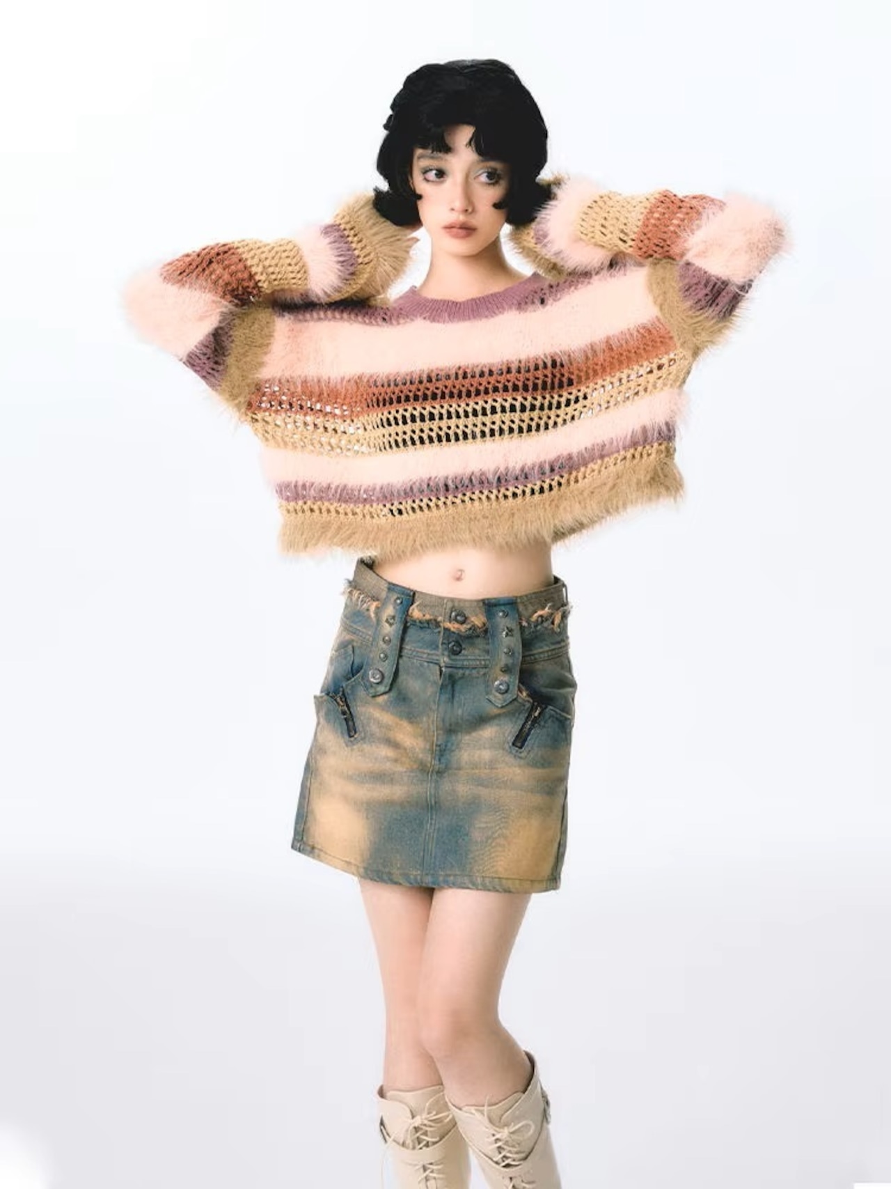 モヘア セーター ニット トップス ボーダー柄 透かし ショート丈 韓国 ストリート系 Y2Kファッション ダンス 衣装 K-POP ギャル 長袖 レディース 8NI-67