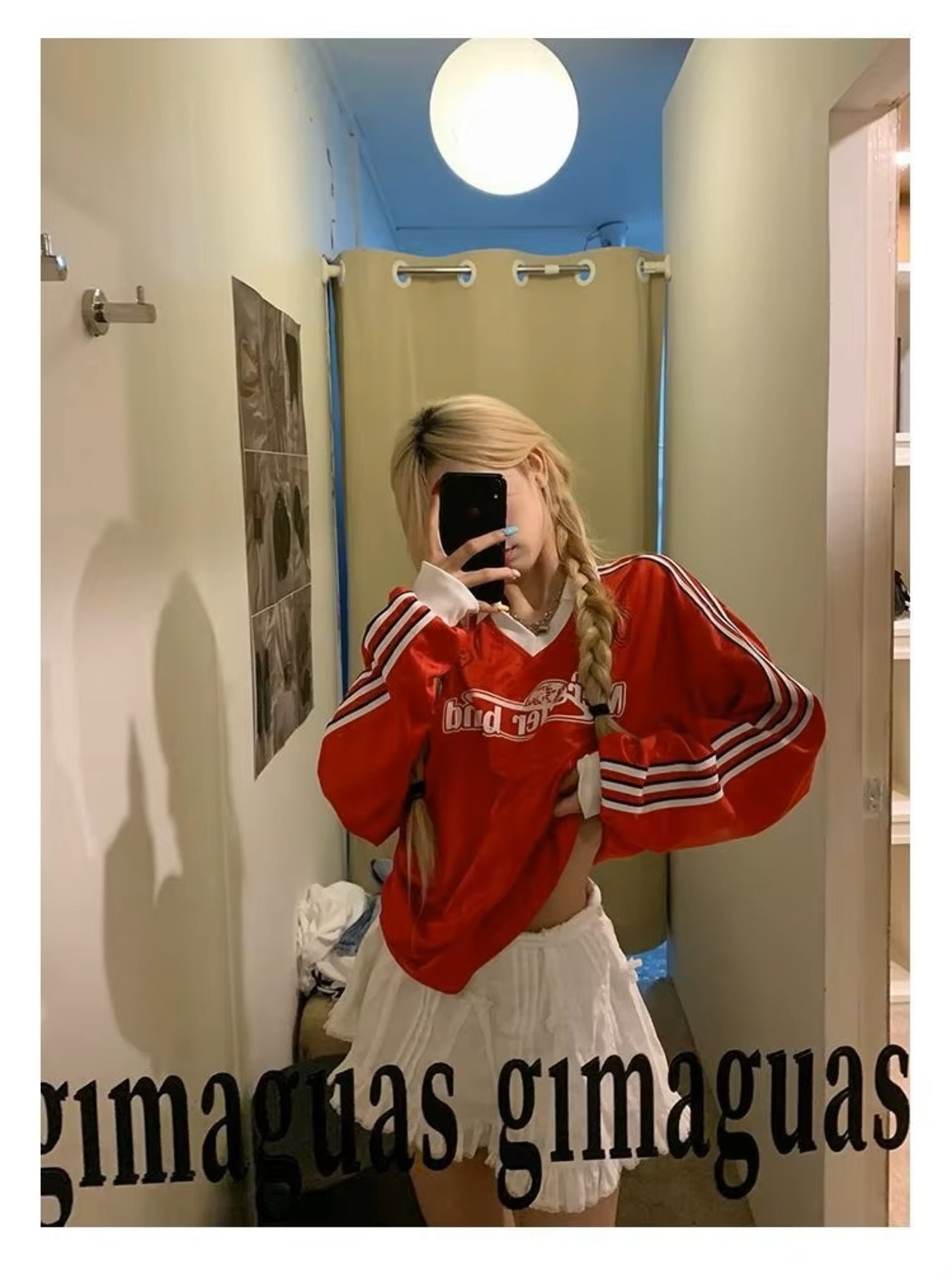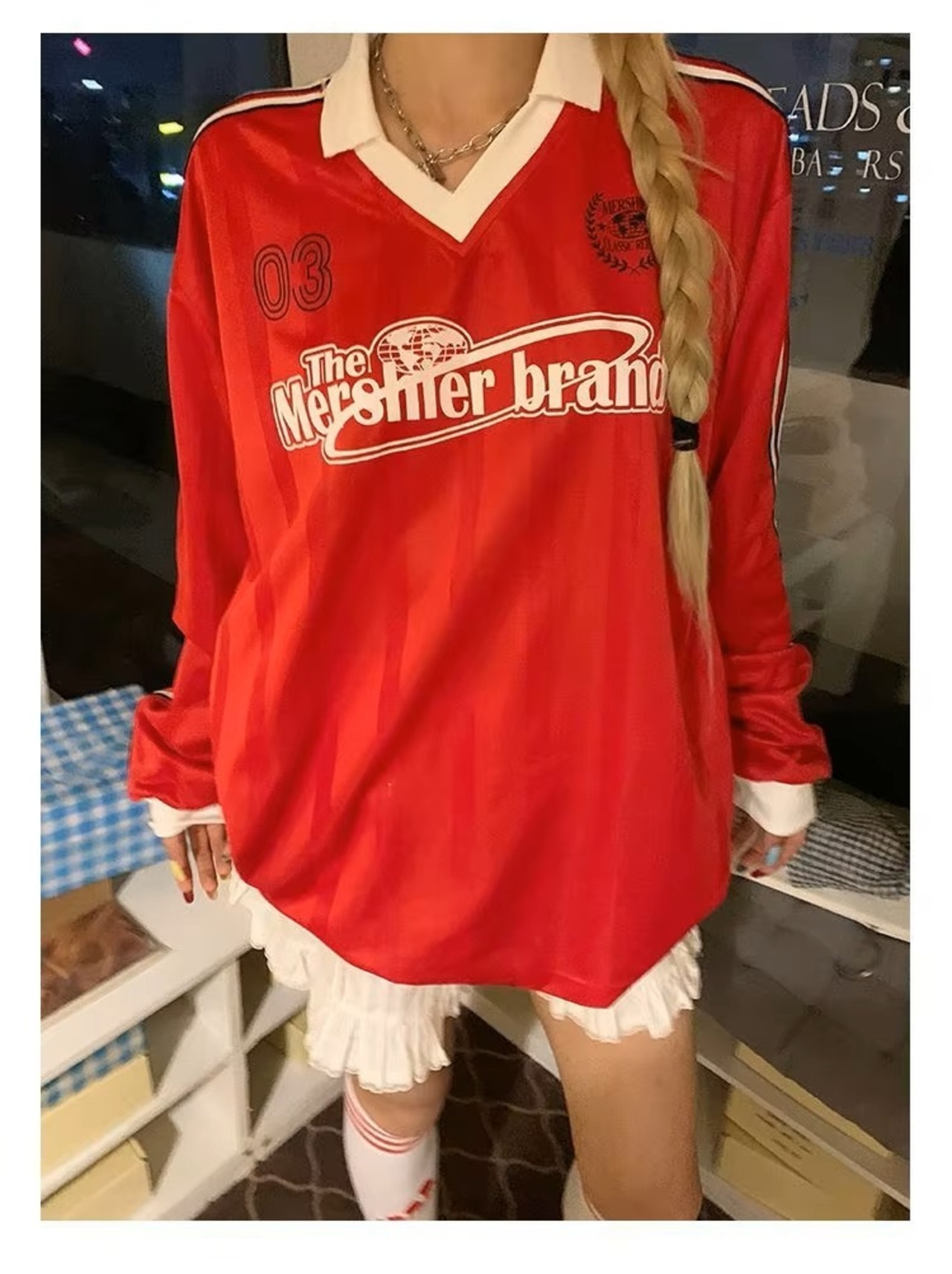 ゲーム シャツ ユニフォーム 長袖 ロゴ ライン 赤 ロンT スキッパー 韓国 ストリート系 Y2K ダンス 衣装 K-POP HIPHOP ギャル ブロケットコア スポーティー トップス レディース ファッション 8T-442