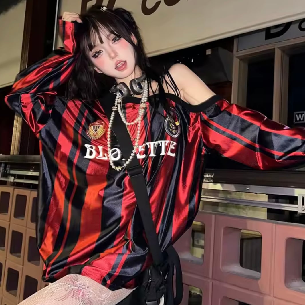 ゲーム シャツ ユニフォーム オフショル ストライプ柄 長袖 ロゴ ライン ロンT 韓国 ストリート Y2K ダンス 衣装 K-POP HIPHOP ギャル スポーティー トップス レッド 赤 レディース 8T-443