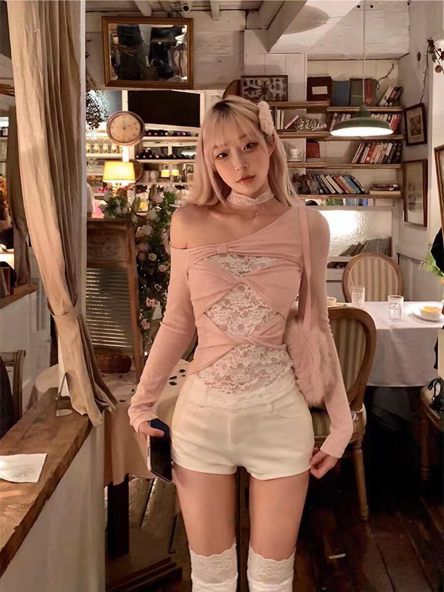 レース オフショル ロンT Tシャツ 長袖 リボン トップス 韓国 ストリート系 バレエコア ギャル ガーリー レディース 8T-452