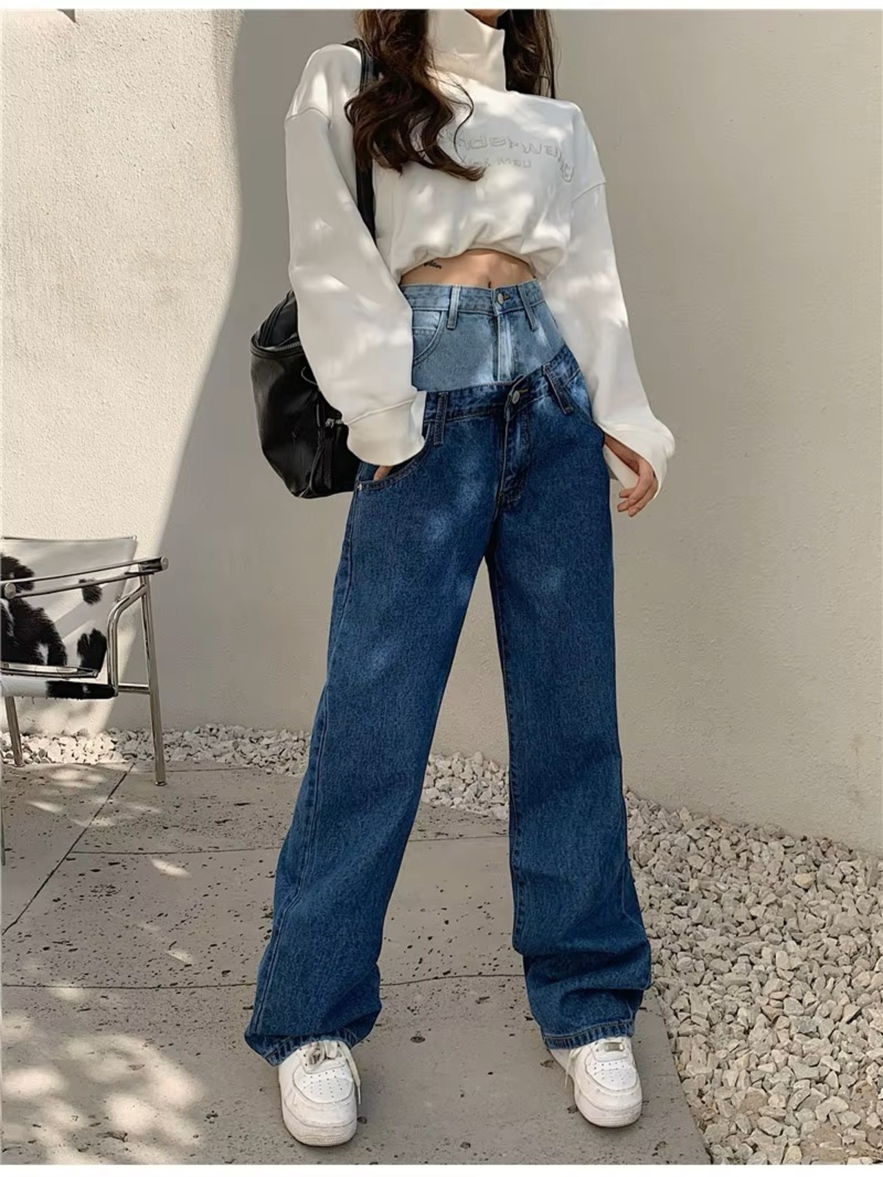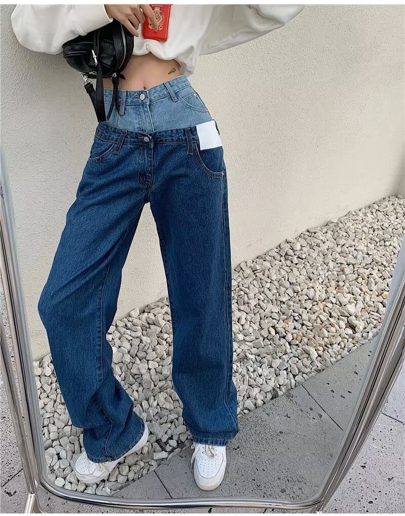 切替 ダブル ウエスト デニム パンツ ジーンズ 韓国 ストリート系 ダンス 衣装 K-POP HIPHOP レディース ファッション 8J-185
